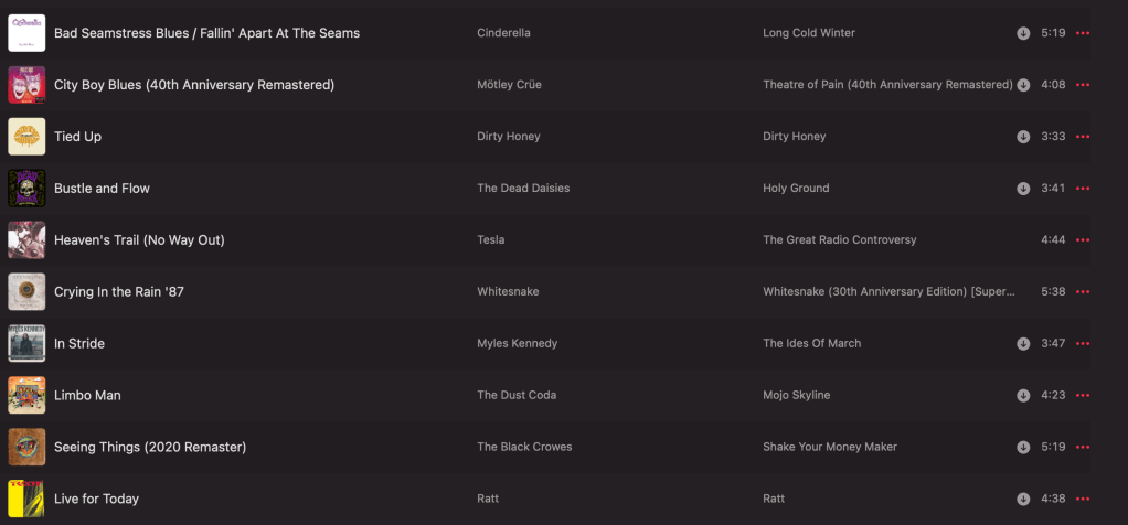 Current tracks by Dirty Honey, The Dead Daisies, Myles Kennedy, The Dust Coda